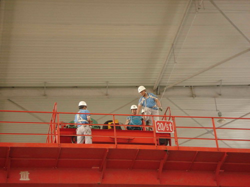 此次預演活動的主要內容是,吊車在運行過程中突然停電后工作人員的應變能力。演習開始了,首先,停電后吊車工先把開關手柄放置到“零位”并監(jiān)控總電源。同時,生產部裝配班、物流班部分員工在各自科長的帶領下在吊運物件下設護欄并監(jiān)護,以防有人誤進危險區(qū)域。其次,生產技術部維修人員按照安全操作規(guī)程,爬上吊車走臺,盤車移動到合適位置然后慢慢拉、合抱閘把物件送回地面。最后,解除危險。
